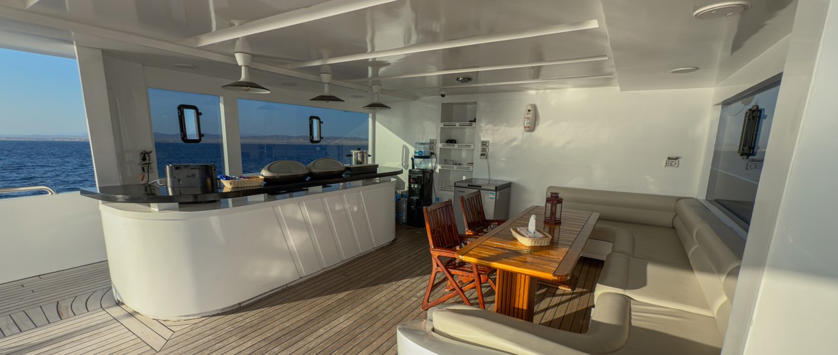 • 4 decks, dining area, salon, bar on upper deck, two spacious sun lounges with sun-beds, tables